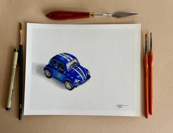 "Blue Racer No. 3” features a stylized, vintage blue car with white racing stripes and the number "3" prominently displayed on the door and roof. The design resembles a classic Volkswagen Beetle but has been given a playful, slightly exaggerated form—compact with rounded features and oversized wheels. The car is painted with a smooth, glossy finish that reflects light realistically, giving it a polished, almost die-cast model appearance. The background is minimalist, with a clean white space that makes the vibrant blue of the car pop, and there's a soft shadow trailing behind the vehicle, adding depth and grounding it to the surface. Overall, the artwork combines a sense of nostalgia with a modern, illustrative style that gives it charm and personality.